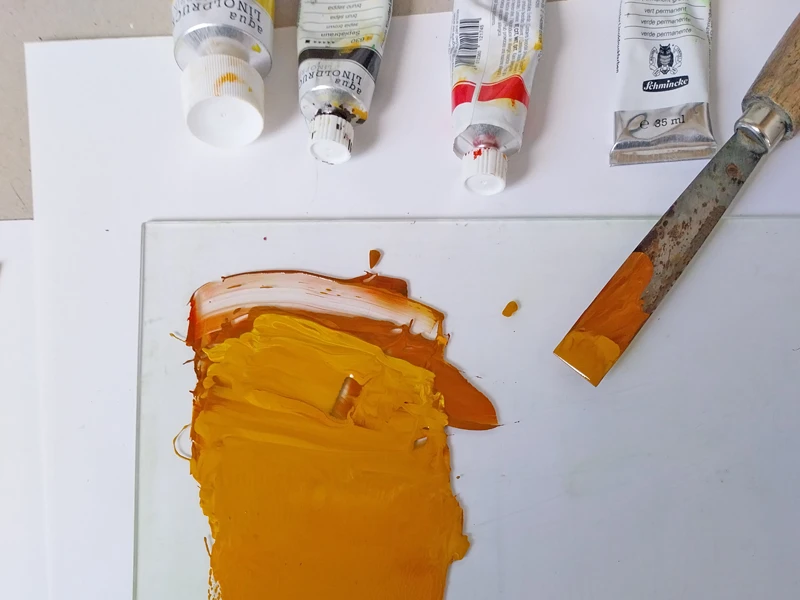 Ich bearbeite die Farbe auf einer Glasplatte, bis sie richtig geschmeidig wird.