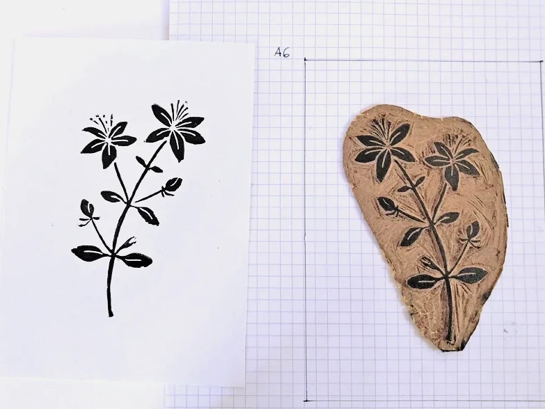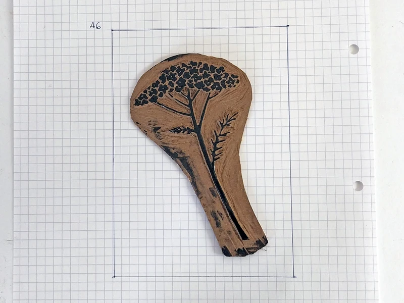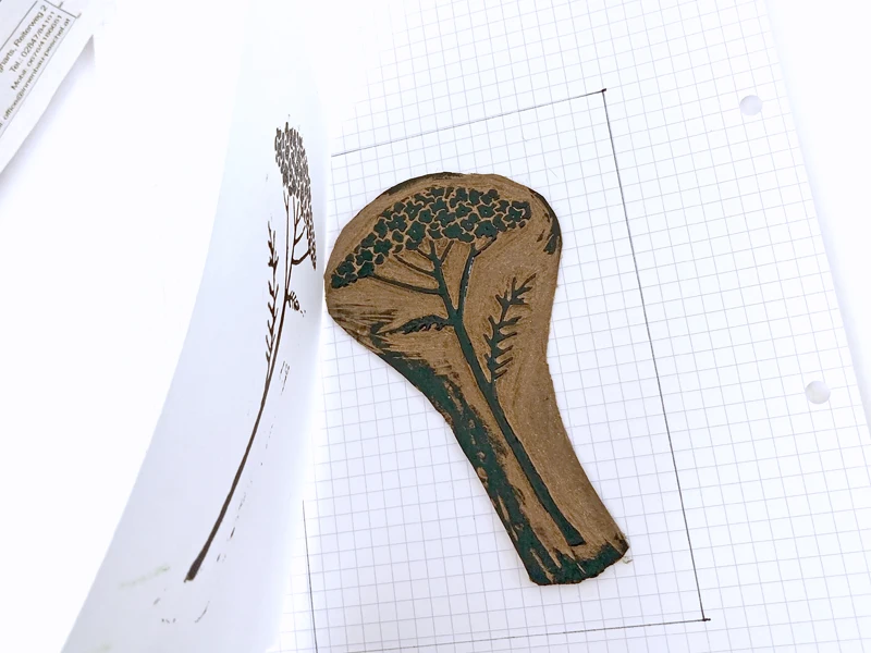 Dann walze ich die Druckplatte ein. Hier habe ich eine Schafgarbe geschnitzt.