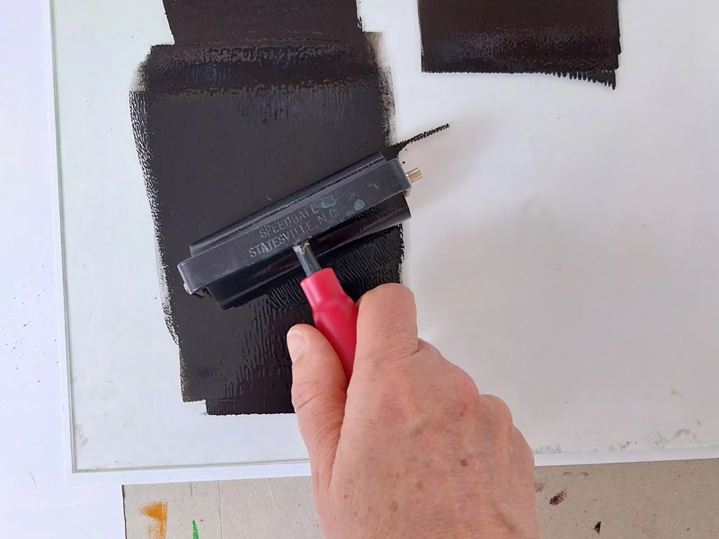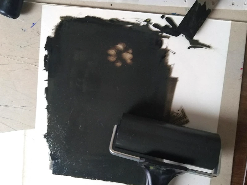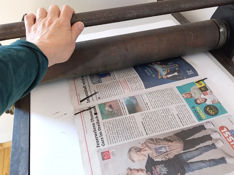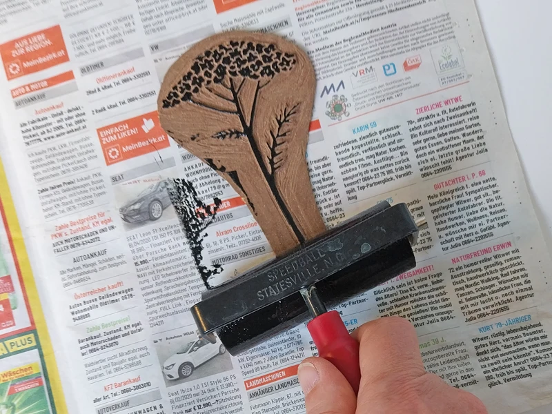 Zeitungspapier zum Schutz darauf – und langsam die Walze drüber ziehen. Ich liebe das Geräusch, das dabei entsteht.