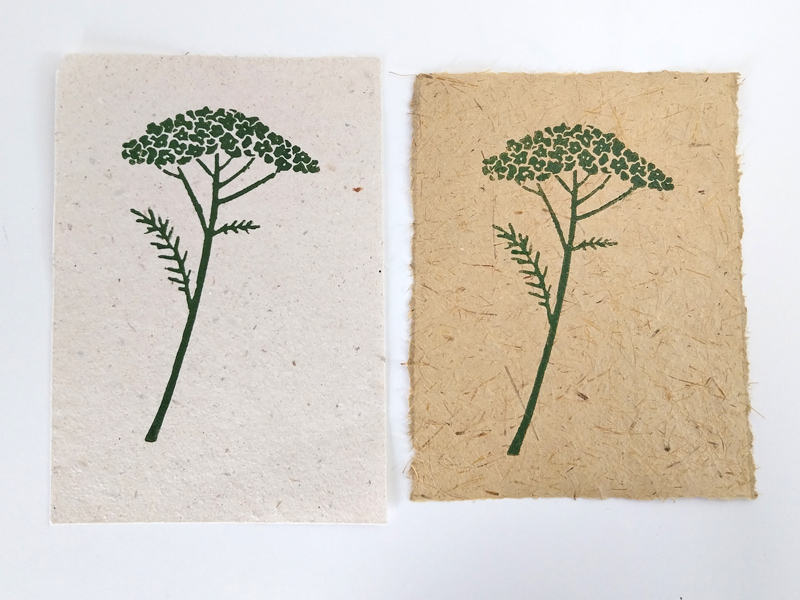 Zuletzt hatte ich zwei Kräuter-Sujets aus Linolplatten geschnitzt. Inzwischen sind ein paar dazugekommen. Jetzt will ich das Ganze gerne drucken. Dazu habe ich verschiedene Papiere im Format A6 vorbereitet, auch selbst geschöpfte.