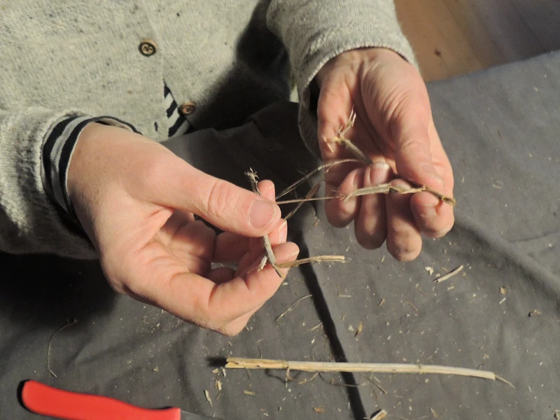 In den folgenden Tagen und Wochen machen wir wir weiter. Dieses „Kletzeln“ macht süchtig. Ich kann kaum an der Schachtel mit den Stängeln vorbeigehen, ohne ein paar Fasern abzuziehen. Jede kleine Computerpause wird dem Schälen gewidmet. Und bei jedem Spaziergang schnappe ich mir eine dürre Nessel und schäle im Gehen. Meine Taschen sind voller Nesselhautbällchen.