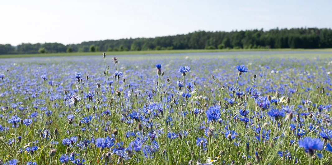 Mitte Juni bekommen manche Felder „blaue Flecken“. Bei uns im Waldviertel beginnen die Kornblumen zu blühen. Schon von weitem sehen wir die leuchtend blauen Inseln im Grün. Das Feld auf dem Bild ist eigentlich ein Haferfeld. Hier fühlt sich die Kornblume sichtlich wohl – bestimmt ein Bio-Feld.