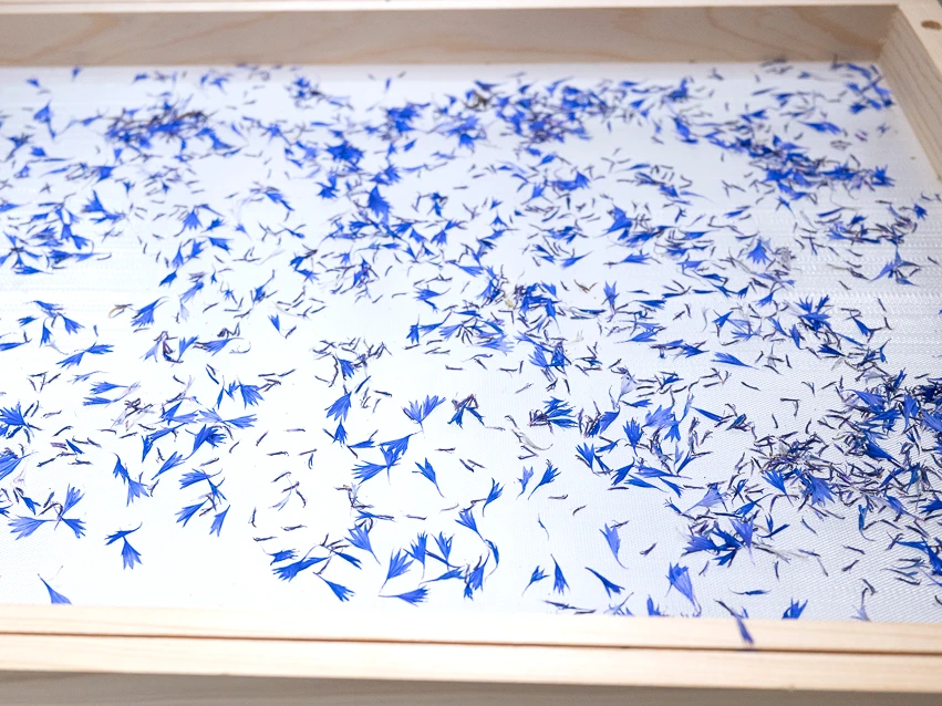 Ich würde gern Papier mit eingeschöpften Blütenblättern ausprobieren. Christian ist nicht begeistert, er findet das ein bisschen kitschig. Aber er meint, dass man grundsätzlich aus allem Papier machen kann – also warum nicht auch aus der ganzen Kornblumenpflanze.