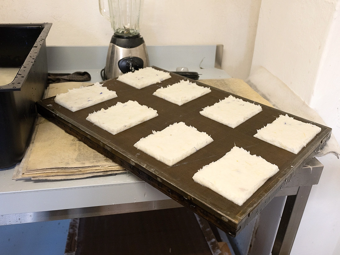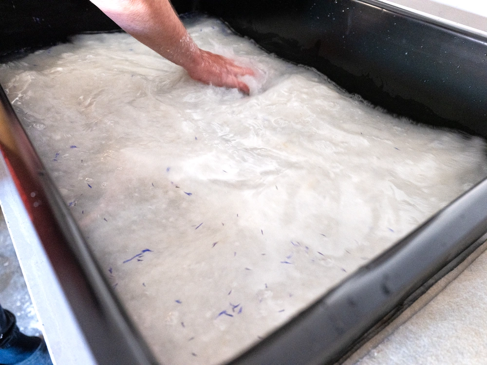 Die Basis für die Pulpe besteht aus Baumwolle. Dazu kommen etwa 20 % der gekochten und zerkleinerten Pflanzen. Die Blütenblätter werden zum Schluss untergemischt – und verschwinden beinahe in der großen Wanne.