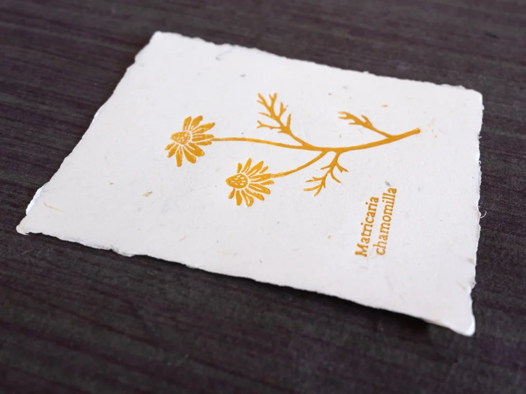 Unsere „türgetrockneten“ Papiere haben alle eine raue und eine glatte Seite. Die Seite, mit der sie an der Tür gehaftet haben, ist die glatte – und die, auf der ich lieber drucke. Das Kornblumen-Baumwoll-Papier eignet sich sehr gut für hellere Farben. Und da es so dick und weich ist, entsteht beim Hochdruck ein leichter Prägeeffekt, besonders bei der Schrift. Die Druckplatte für die Schrift habe ich übrigens nicht geschnitzt (das hätte ich nie so exakt geschafft), sondern mittels einem fotoempfindlichen Material hergestellt. Dazu vielleicht einmal mehr …
