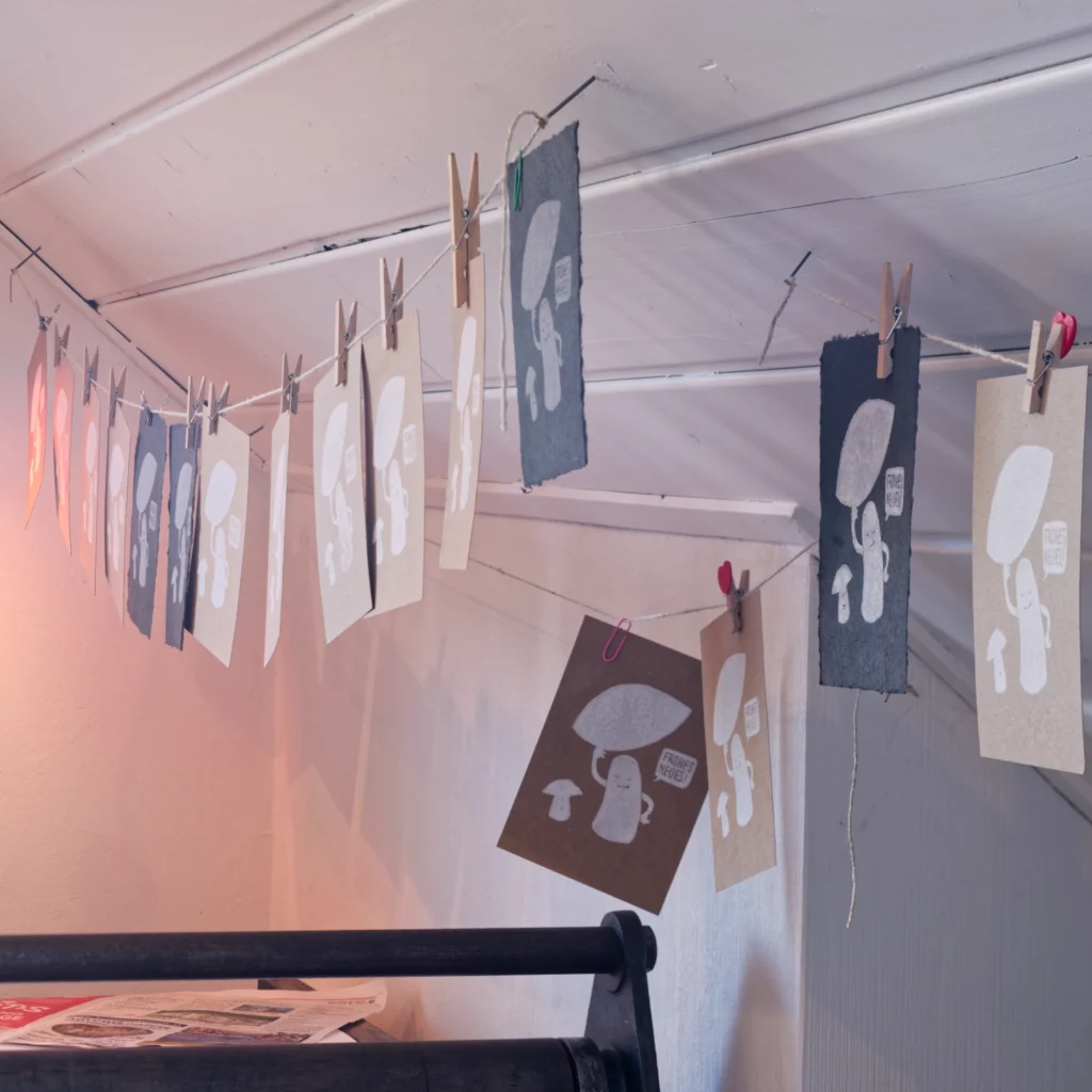 Oben in der Druckwerkstatt dagegen ist es warm und die „halbgaren“ Neujahrskarten warten auf den zweiten Druckdurchgang.