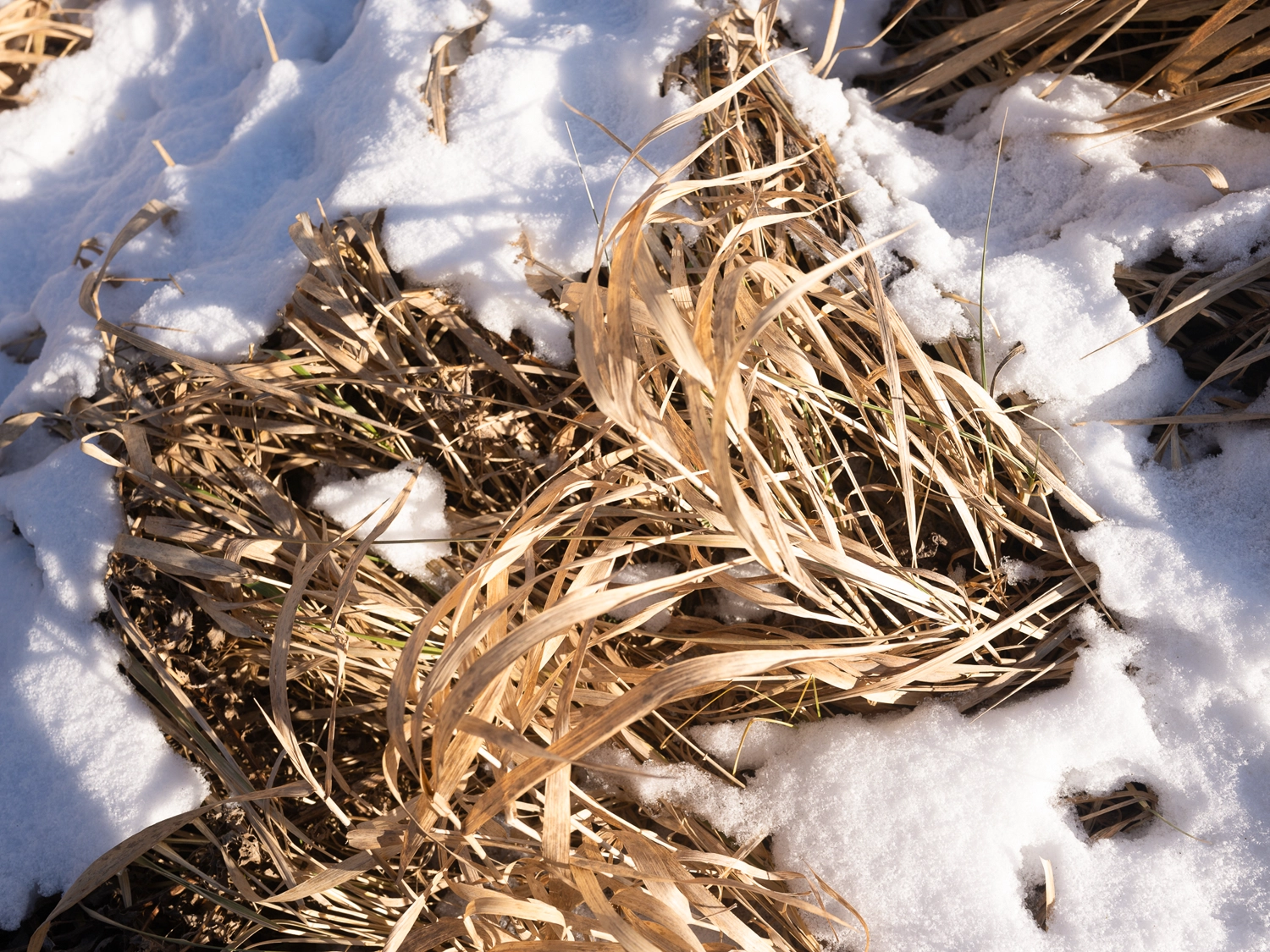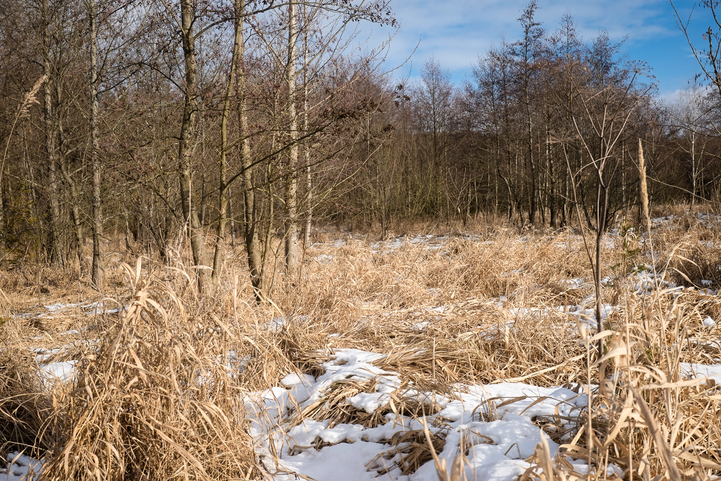 Jetzt im Winter ist alles braun – dazwischen hart gefrorene Reste vom letzten Schneefall. Das Schilfgras, das sonst so hoch steht, hat sich hingelegt. Die trockenen Büscheln zwischen den Schneehaufen rascheln im Wind.
