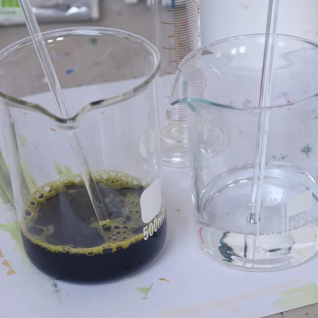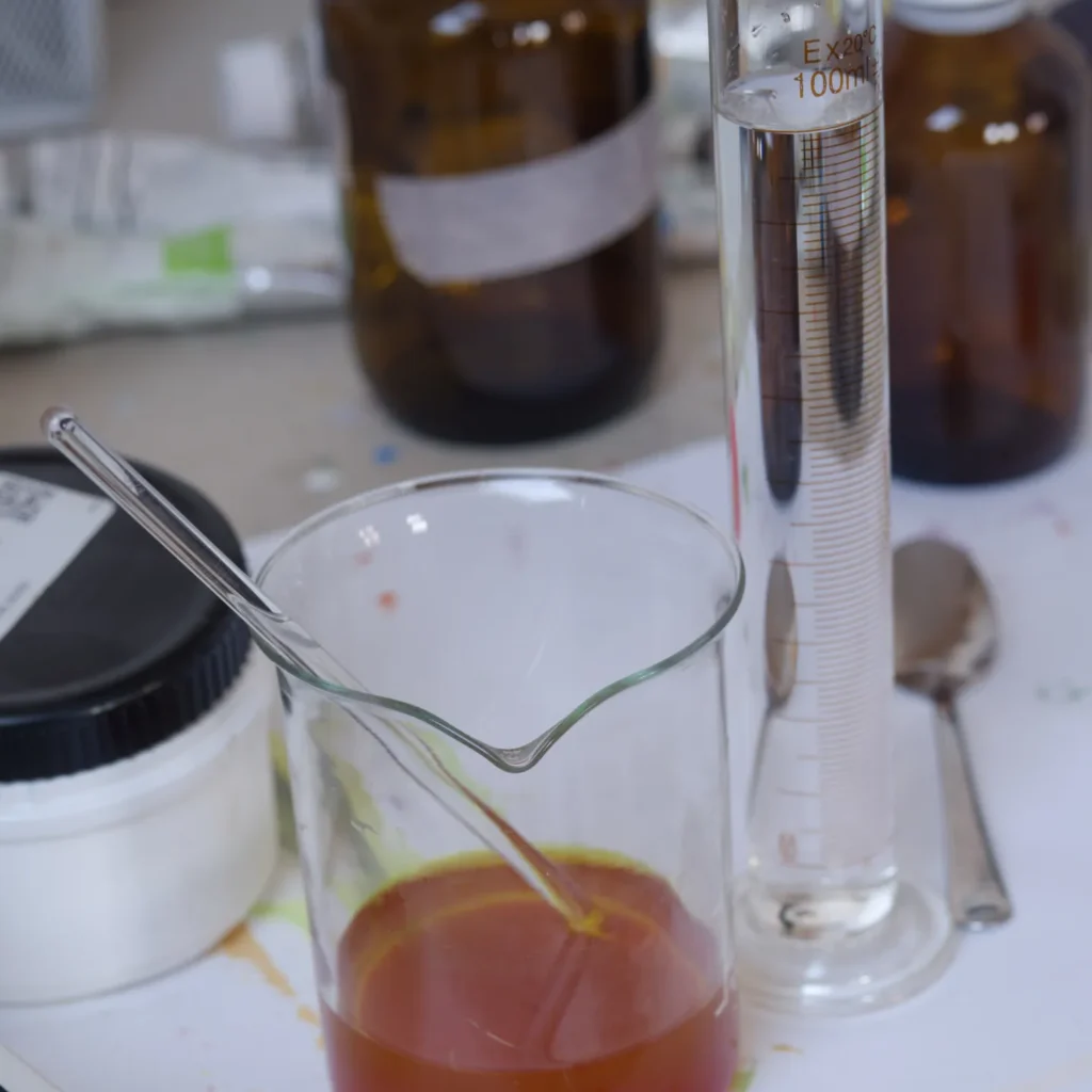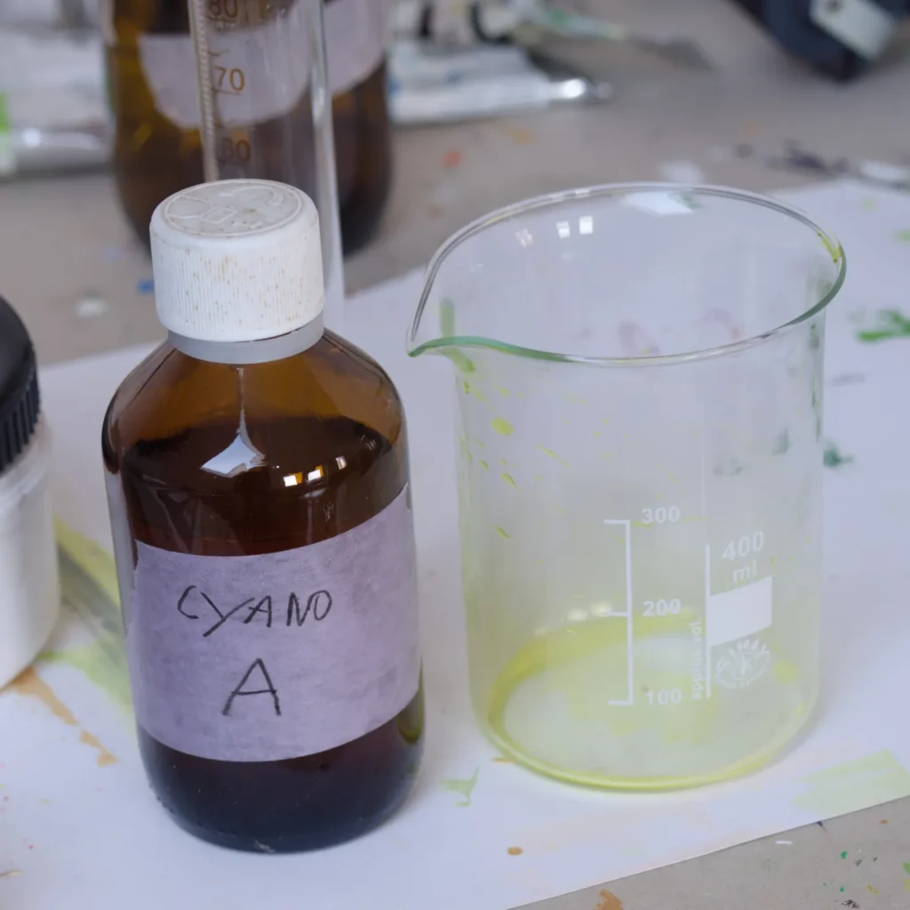 Schritt drei: gibt es nicht, wir sind fertig. Wir haben jetzt zwei Lösungen, die getrennt von einander jahrelang haltbar sind. Vor Gebrauch zu gleichen Teilen in benötigter Menge mischen und innerhalb von ein paar Stunden verwenden. Achtung: sobald die zwei Chemikalien vermischt sind, ist diese Mischung UV-lichtempfindlich.