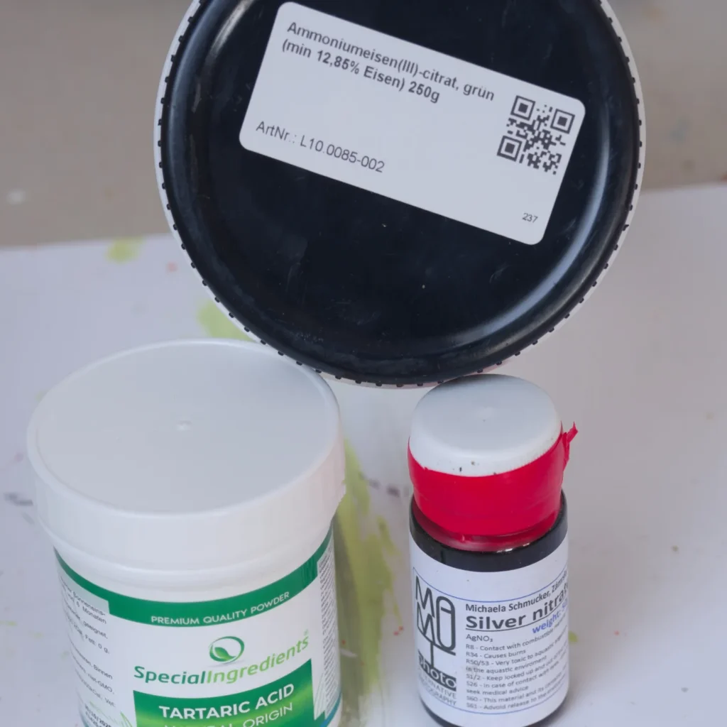 Für die Cyanotypie benötigt man Ammoniumeisen(III)-citrat und Kaliumhexacyanoferrat. Letzteres hört auch auf den hübscheren Namen ‚rotes Blutlaugensalz‘. Ich habe mich jahrelang an das ursprüngliche Rezept des Erfinders John Herschel gehalten, bin aber letztes Jahr über das wunderbare Buch ‚Cyanotype Toning‘ von Annette Golaz gestolpert. Im Buch geht es hauptsächlich darum, das doch sehr blaue Blau der Cyanotypie mit Hilfe von anderen Pflanzen loszuwerden und durch einen ganzen Regenbogen an Farbmöglichkeiten zu ersetzen.