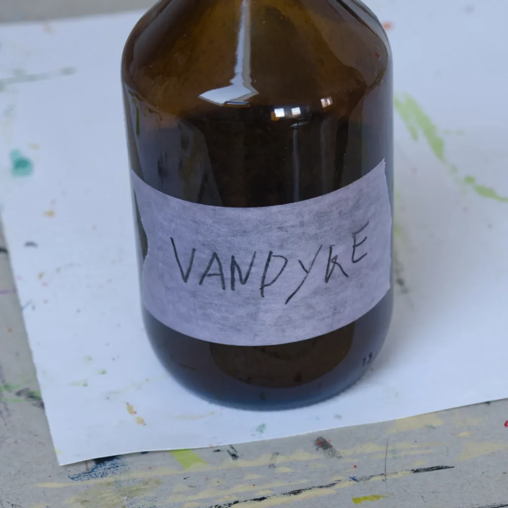 Die Chemie für Van Dyke Drucke ist nicht viel komplizierter. Hier verwenden wir nicht 2 Chemikalien, sondern 3. Dafür brauchen wir nur eine braune Glasflasche. Das Rezept ist diesmal das überlieferte Original und geht wie die Cyanotypie auf John Herschel zurück.